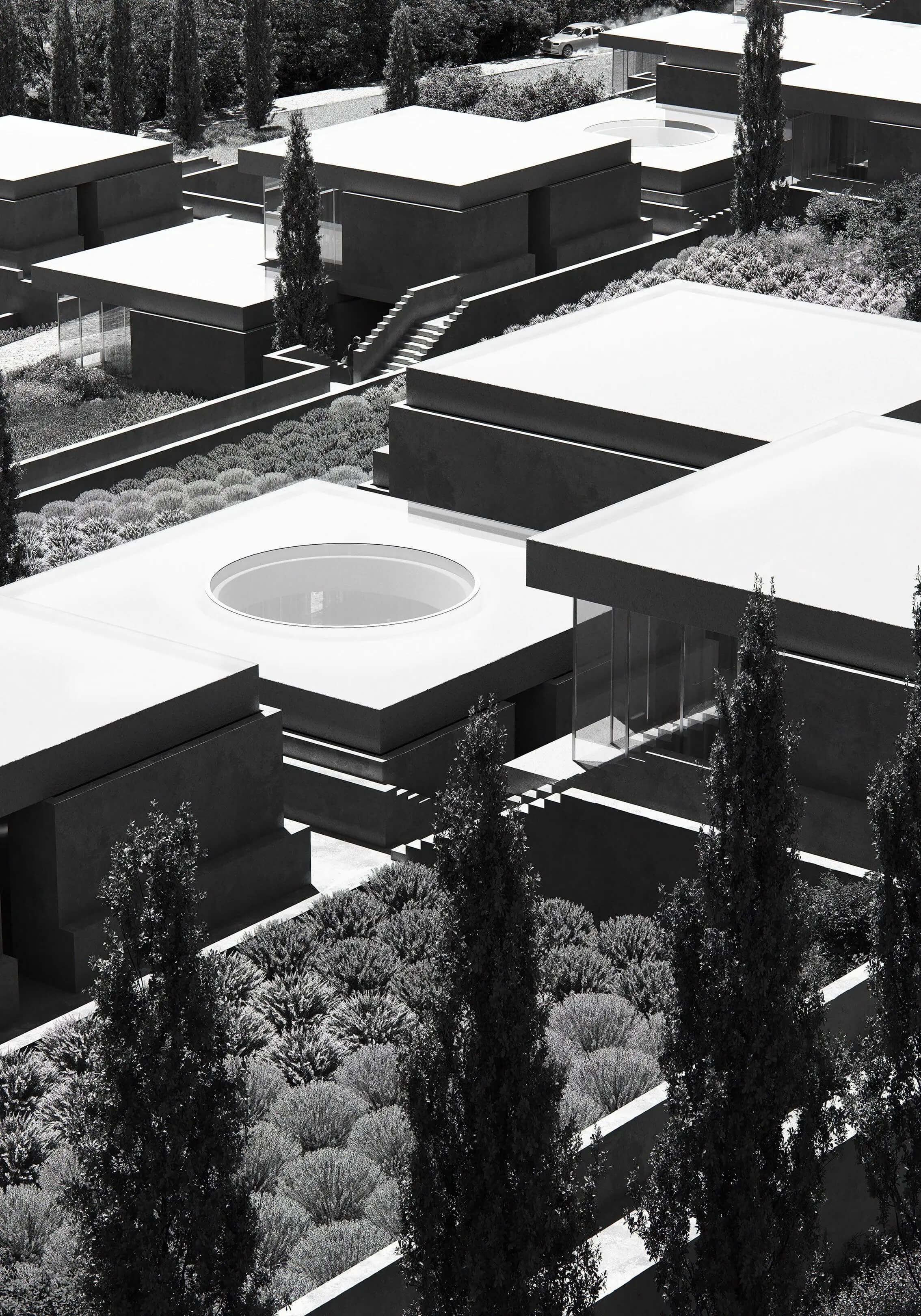 Nestled within the landscape of Montinhoso near Lisbon, the development envisions a network of modular villas arranged along pathways that lead to shared facilities such as the restaurant, spa and gym. Agricultural zones—orchards, vegetable plots and beehives—surround the built environment, supporting a farm-to-table approach where the land directly contributes to the guest experience. Architecture remains deliberately low and recessed into the terrain, minimizing visual impact and preserving the existing topography. The atmosphere is defined by calm transitions between built and natural elements, with pathways, courtyards and open views organising the spatial rhythm of the resort.