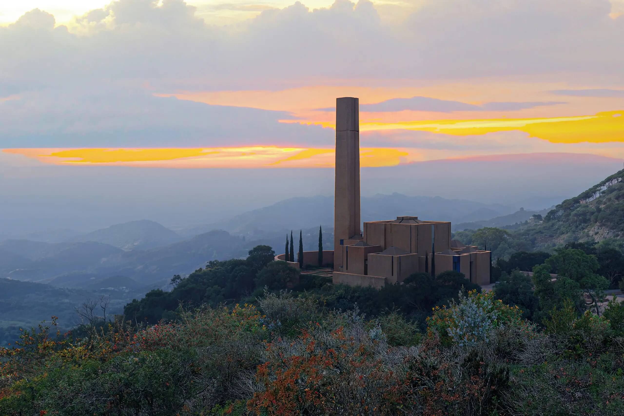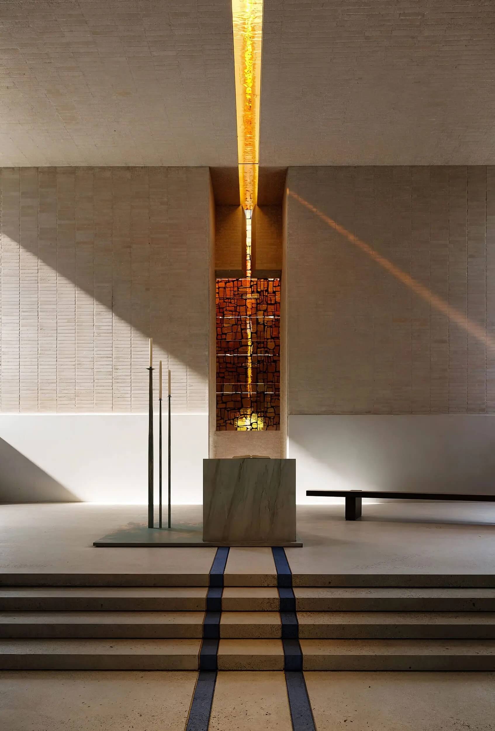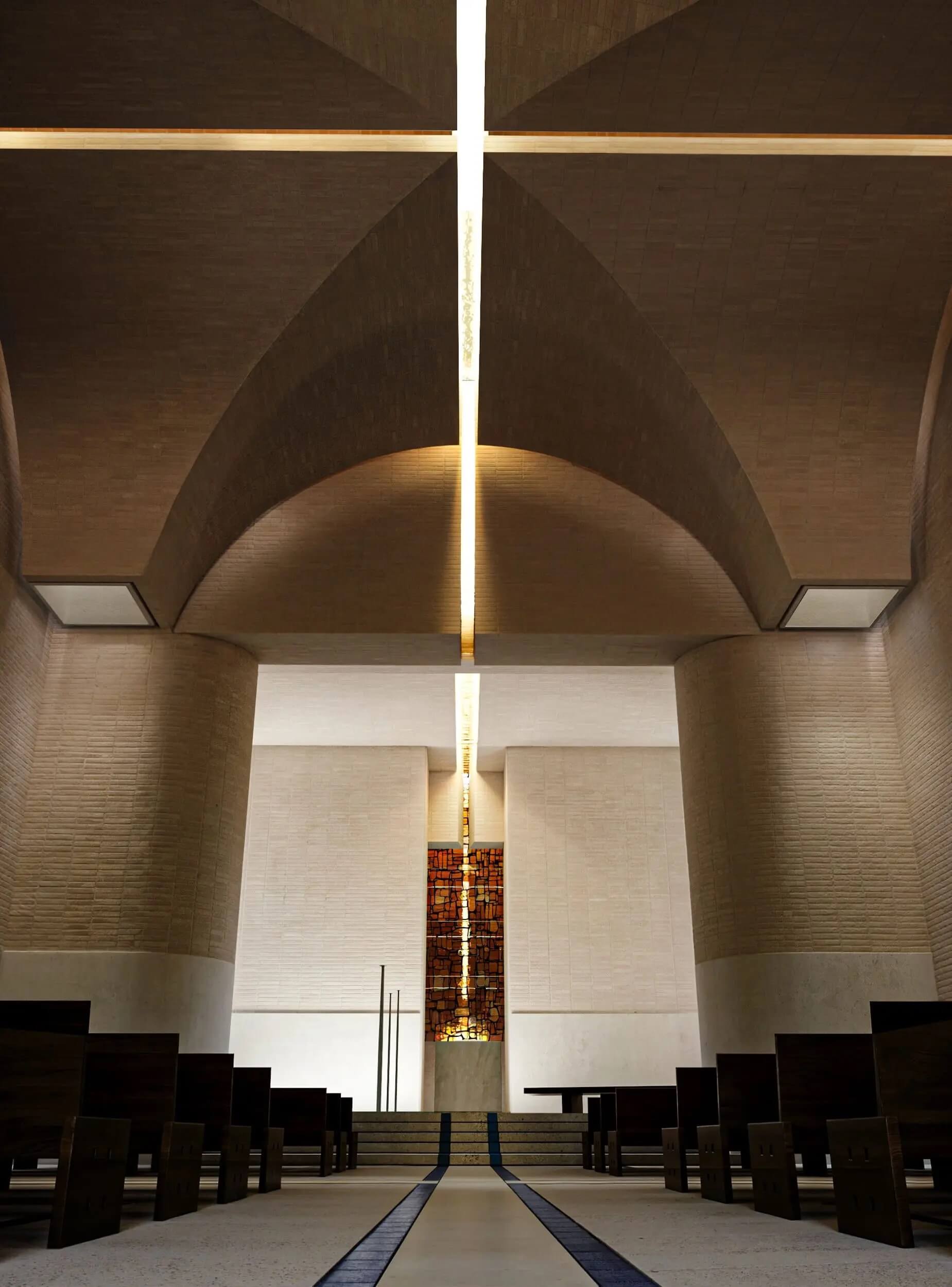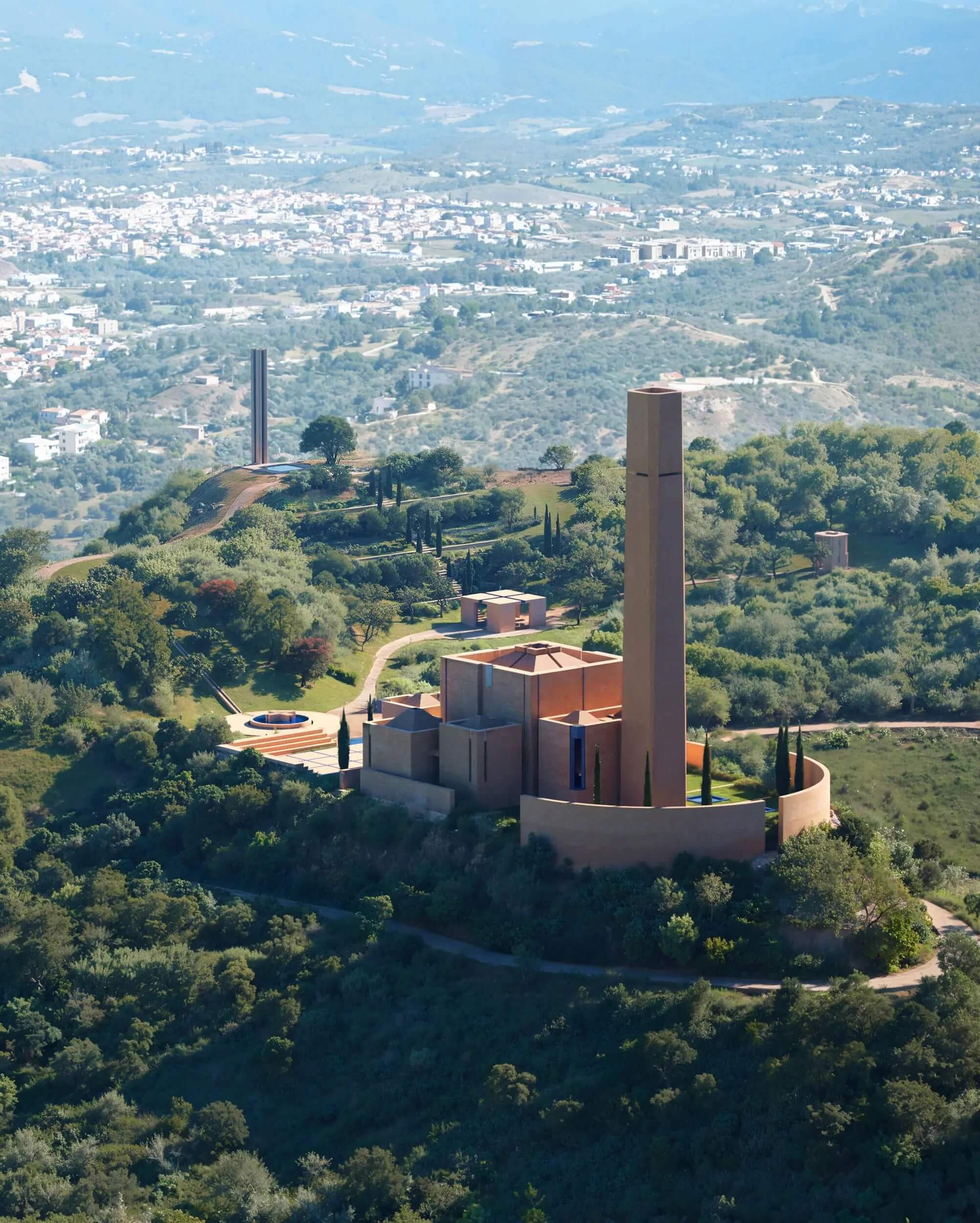 Set on Lapidari Hill above Tirana, the sanctuary approaches sacred space through a close relationship with the surrounding landscape. The complex is composed of three primary volumes—a church, a monument and a pavilion—embedded into the sloping terrain and connected by a slow, ascending path that guides visitors from city views toward an open horizon. Five symbolic gardens appear along the way, creating quiet moments for pause and reflection. Inside, the church follows a cruciform geometry where natural light enters through filtered openings and stained-glass tower windows. The material palette draws from the blue and white colours associated with Mother Teresa, giving the architecture a sense of clarity, restraint and spiritual simplicity.